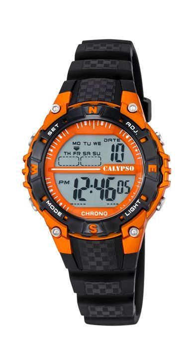 Detalles en color negro y naranja, y medidas de 38 mm de diámetro de la caja, que es de plástico, y 20 mm de ancho de correa.