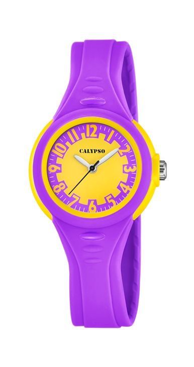Reloj Calypso Analógico en color morado y amarillo, caja de plástico de 32,70 mm de diámetro, y correa de caucho de 20 mm de ancho.