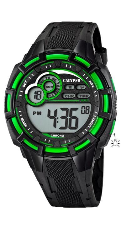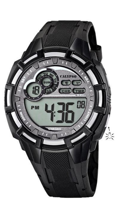 Reloj Calypso digital en color negro con esfera plateada, correa de caucho de 25 mm de ancho y caja de plástico con 45,05 mm de diámetro.