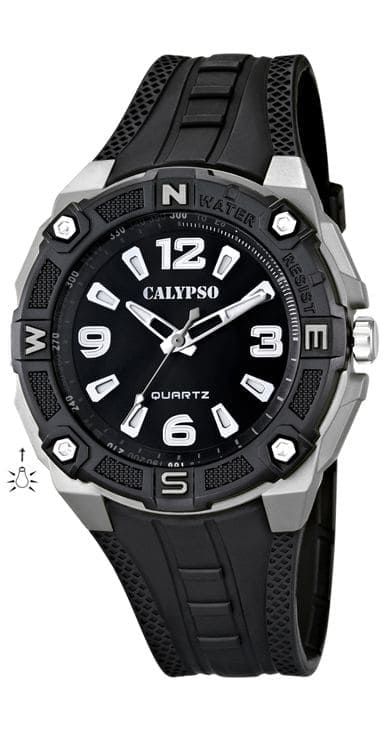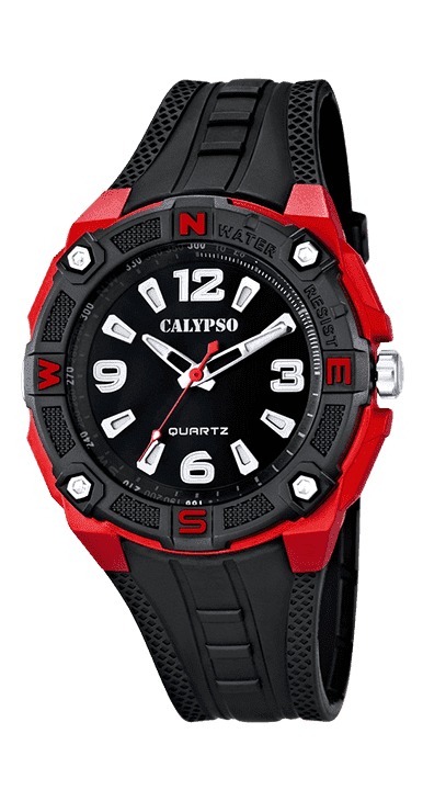 Reloj Calypso Analógico con correa de caucho en color negro de 29 mm de ancho y caja de plástico en colores negro y naranja con 43,50 mm de diámetro.