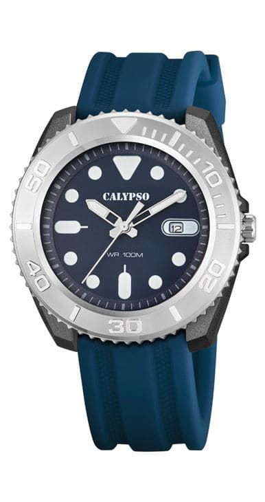 Reloj Calypso Analógico, con caja redonda de plástico, correa de caucho azul marino y calendario.