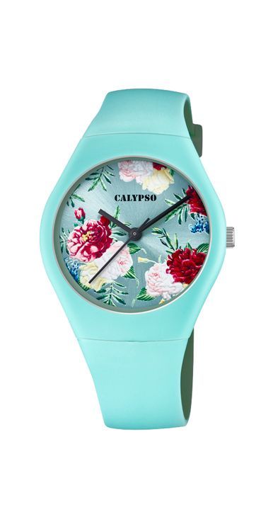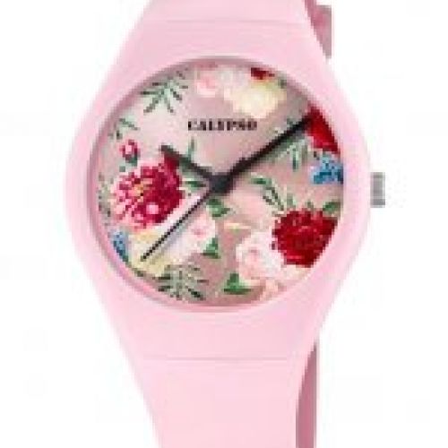 Reloj Calypso analógico en color blanco con caja de plástico y esfera en color blanco adornada de flores.
