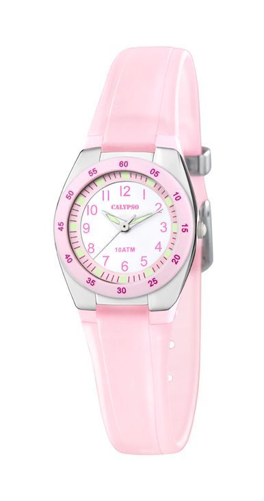 Reloj Calypso analógico en color rosa con caja de plástico y correa de caucho semitransparente.