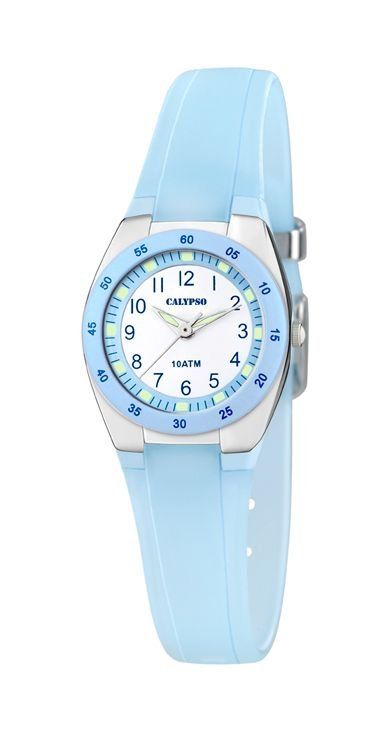 Reloj Calypso analógico en color azul con caja de plástico y correa de caucho semitransparente.