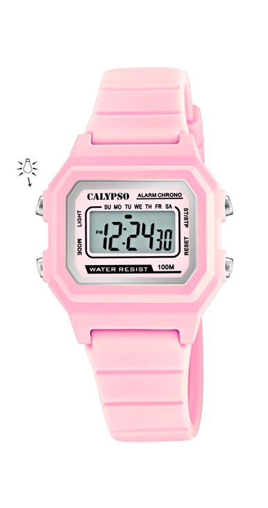 Reloj Calypso digital en color verde fosforito con correa de caucho y caja de plástico.