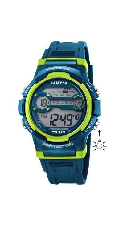 Reloj Calypso digital en color azul verdoso con correa de caucho y caja de plástico con detalles en verde fluorescente.