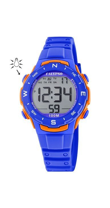 Sumergible, con 10 atmósferas, y caja de plástico en color azul y naranja.