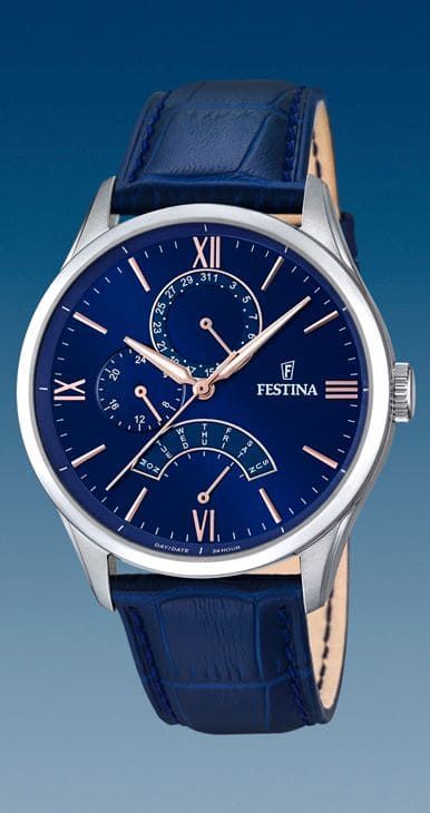 Con caja redonda de 43 mm de diámetro, cristal mineral y correa de cuero de 22 mm de ancho.
