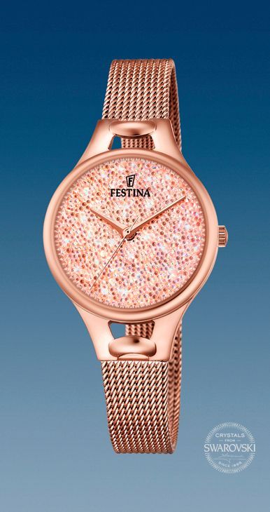 Reloj analógico de cuarzo, esfera con cristal de swarovski en color rosé.