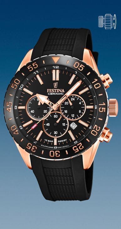 Reloj Festina, Chrono, que combina Acero chapado en Oro Rosa, Cerámica y correa de caucho.
