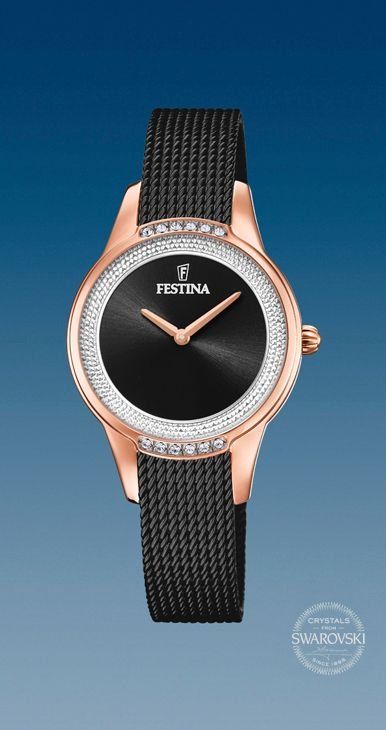 Reloj analógico de cuarzo, esfera con cristal de swarovski en colores negro y plateado.