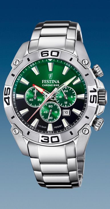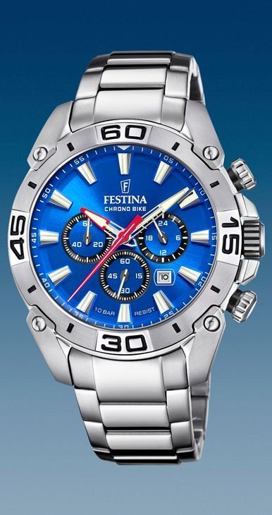 Reloj analógico de cuarzo, con esfera azul, cronógrafo y calendario.