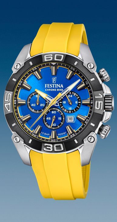 Reloj analógico de cuarzo, con esfera color azul celeste, cronógrafo y calendario.
