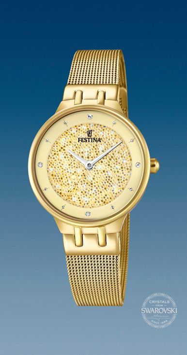 Reloj analógico de cuarzo, de acero con baño de oro y esfera con cristalitos.