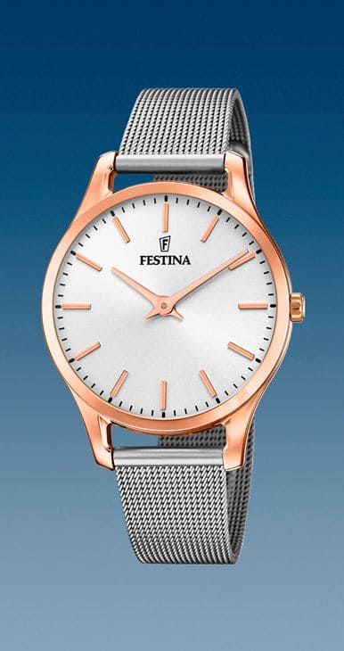 Reloj Festina de Cuarzo Analógico, con caja de acero chapado en oro rosa de 34 mm de diámetro, y armys tipo malla de acero con 14,95 mm de ancho.