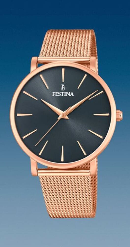 Reloj Festina de Cuarzo Analógico, en acero chapado en oro rosa, con armys tipo malla de 18,95 mm de ancho y caja de 38 mm de diámetro con esfera negra de cristal mineral.