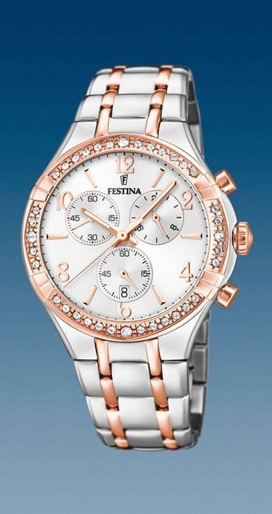 Reloj Festina Bicolor, Analógico de Cuarzo, esfera blanca con cristal mineral y cronógrafo.