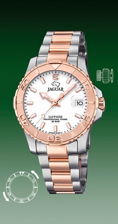 Reloj de señora analógico de cuarzo, con cristal zafiro y esfera blanca con calendario y circonitas.
