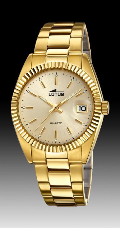 Reloj clásico de acero chapado en oro de cuarzo analógico, en esfera blanca con números romanos y calendario.