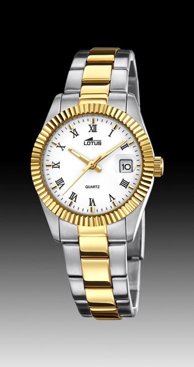 Reloj en acero bicolor de cuarzo analógico estilo clásico, de esfera blanca con numeros romanos y calendario.
