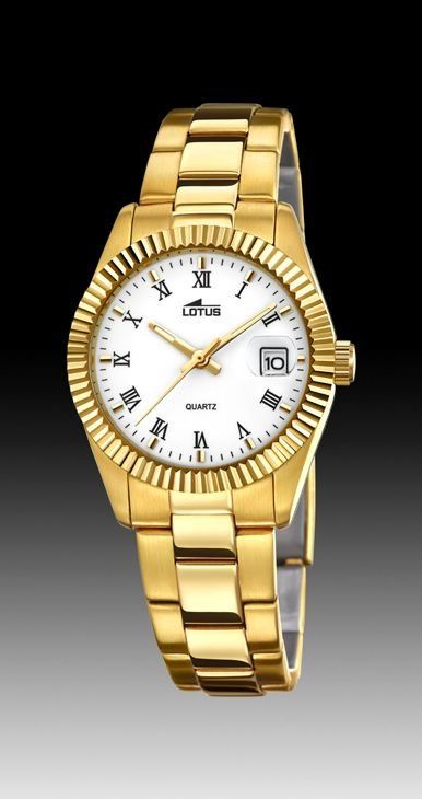 Reloj de cuarzo analógico estilo clásico, de esfera blanca con numeros romanos y calendario.
