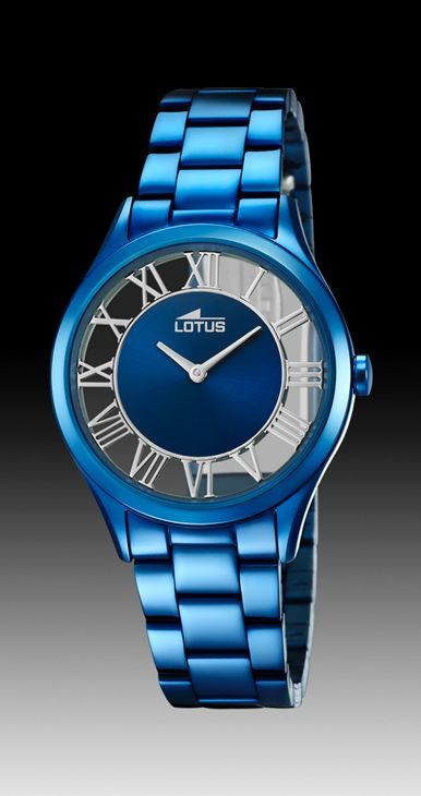 Reloj de acero en ip azul con la esfera calada de números romanos.