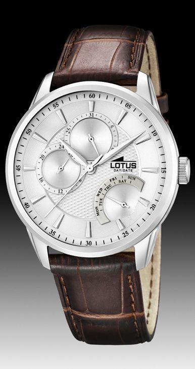 Con caja de acero de 44 mm de diámetro y correa de cuero negra de 22 mm de ancho.