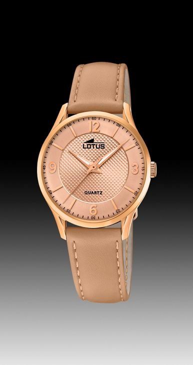 Reloj Lotus de cuarzo analógico estilo clásico, con caja de acero chapada en oro rosa y correa de cuero disponible en diferentes colores.