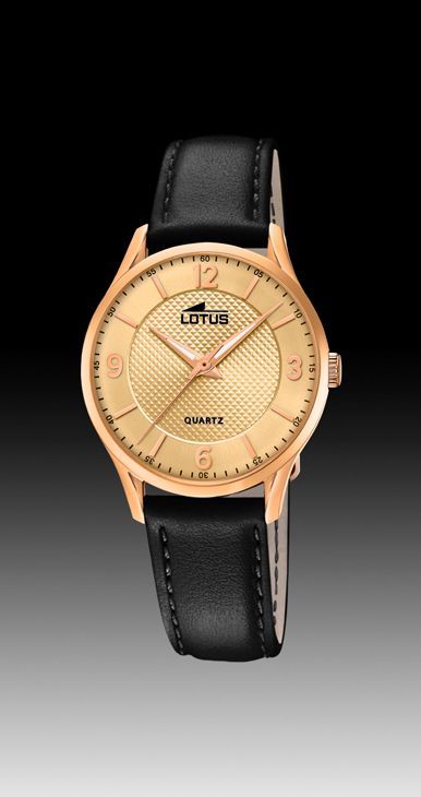 Reloj Lotus de cuarzo analógico estilo clásico, con caja de acero chapada en oro rosa y correa de cuero disponible en diferentes colores.