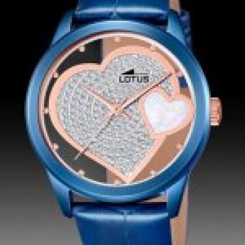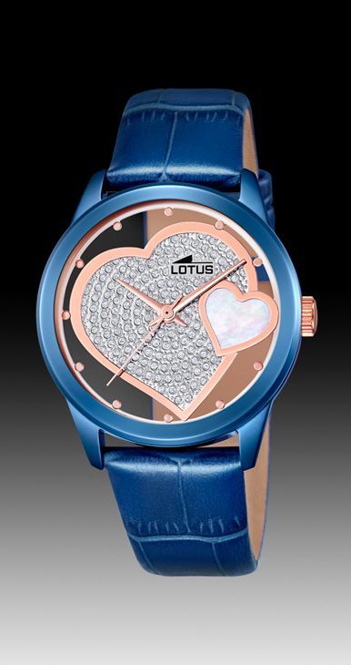 También tiene esfera calada con corazones, uno diamantado y otro nacarado, chapados en oro rosa.