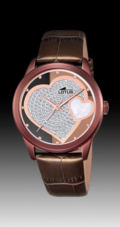También tiene esfera calada con corazones, uno diamantado y otro nacarado, chapados en oro rosa.