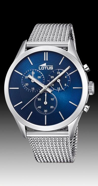 Esfera en color azul marino con cronógrafo y cristal mineral.