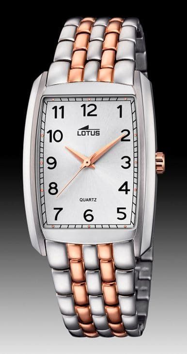 Reloj Lotus Bicolor de Cuarzo Analógico, en acero con esfera blanca rectangular de números árabes negros y cristal mineral.