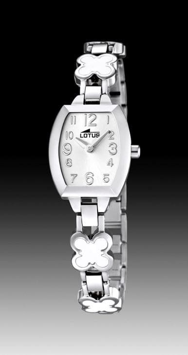 Reloj de Cuarzo, Analógico, con caja rectangular abombada y armys de acero, con adornos de flores blancas esmaltadas.