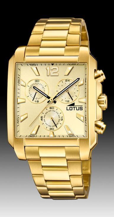 Reloj de Cuarzo, Analógico, con cronómetro, caja rectangular y armys de acero chapado en oro.