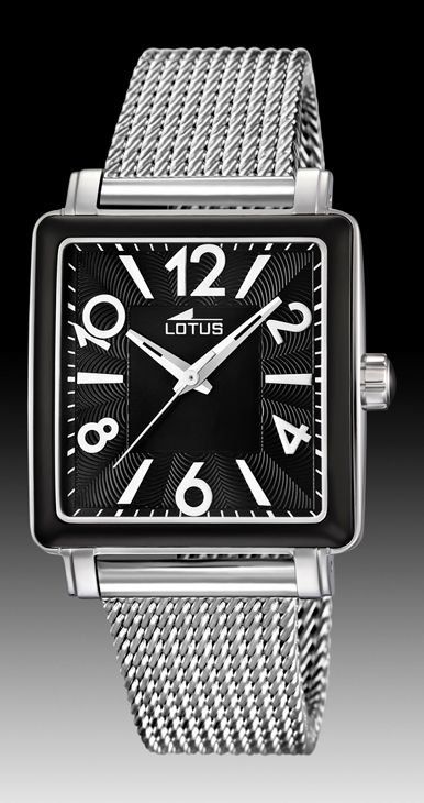 Reloj Lotus de cuarzo analógico en acero con esfera negra rectangular.