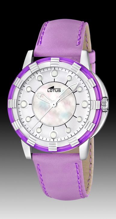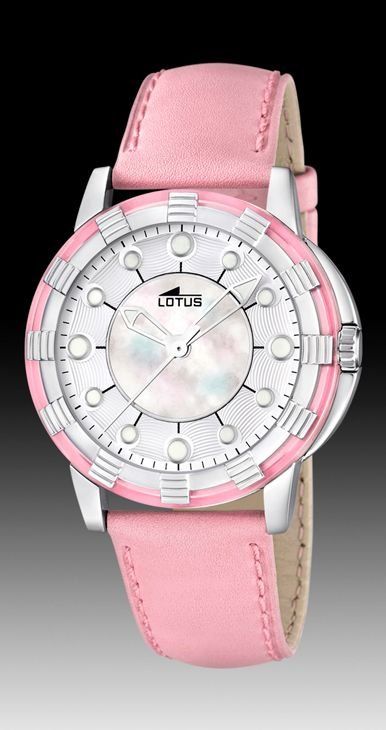 Reloj Lotus de cuarzo analógico en acero con esfera nacarada con circonitas; además lleva correa rosa palo de cuero.