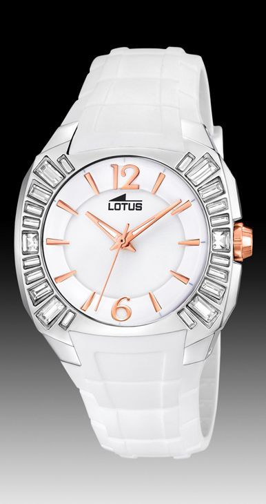 Reloj Lotus de cuarzo analógico en acero con esfera en forma de televisión con circonitas; además lleva correa blanca de caucho.