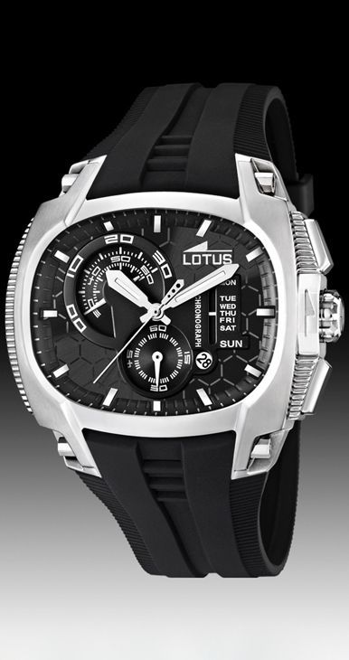 Con cronógrafo y calendario, además lleva correa de caucho negro.