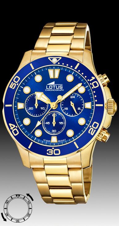 Reloj de caballero de cuarzo analógico en esfera azul, con índices dorados.