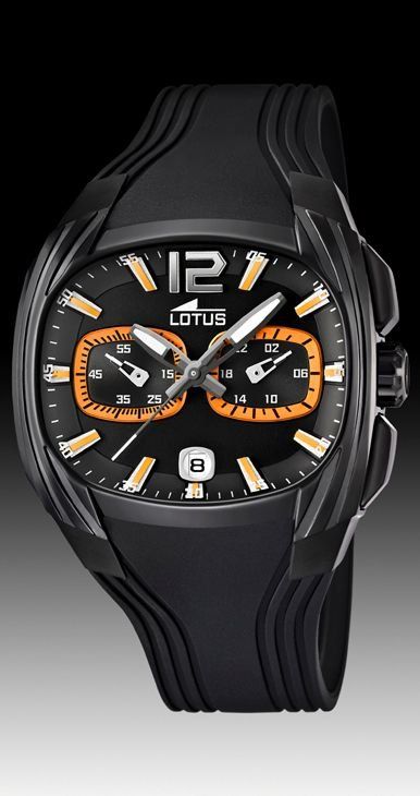 Reloj Lotus con esfera en forma de televisión color negro con detalles naranjas y caja de acero en ip negro, de cuarzo analógico.