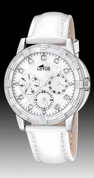 Reloj de Cuarzo, Analógico, Multifunción, con caja de acero y correa de cuero charolada en color blanco.