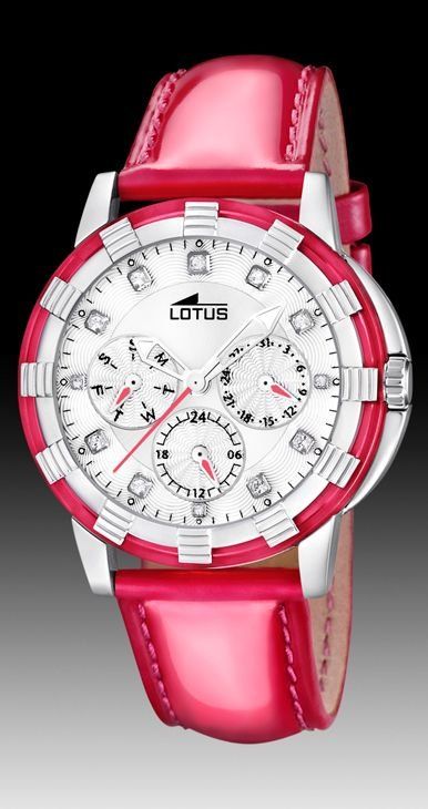 Reloj de Cuarzo, Analógico, Multifunción, con caja de acero y correa de cuero charolada en color rojo.