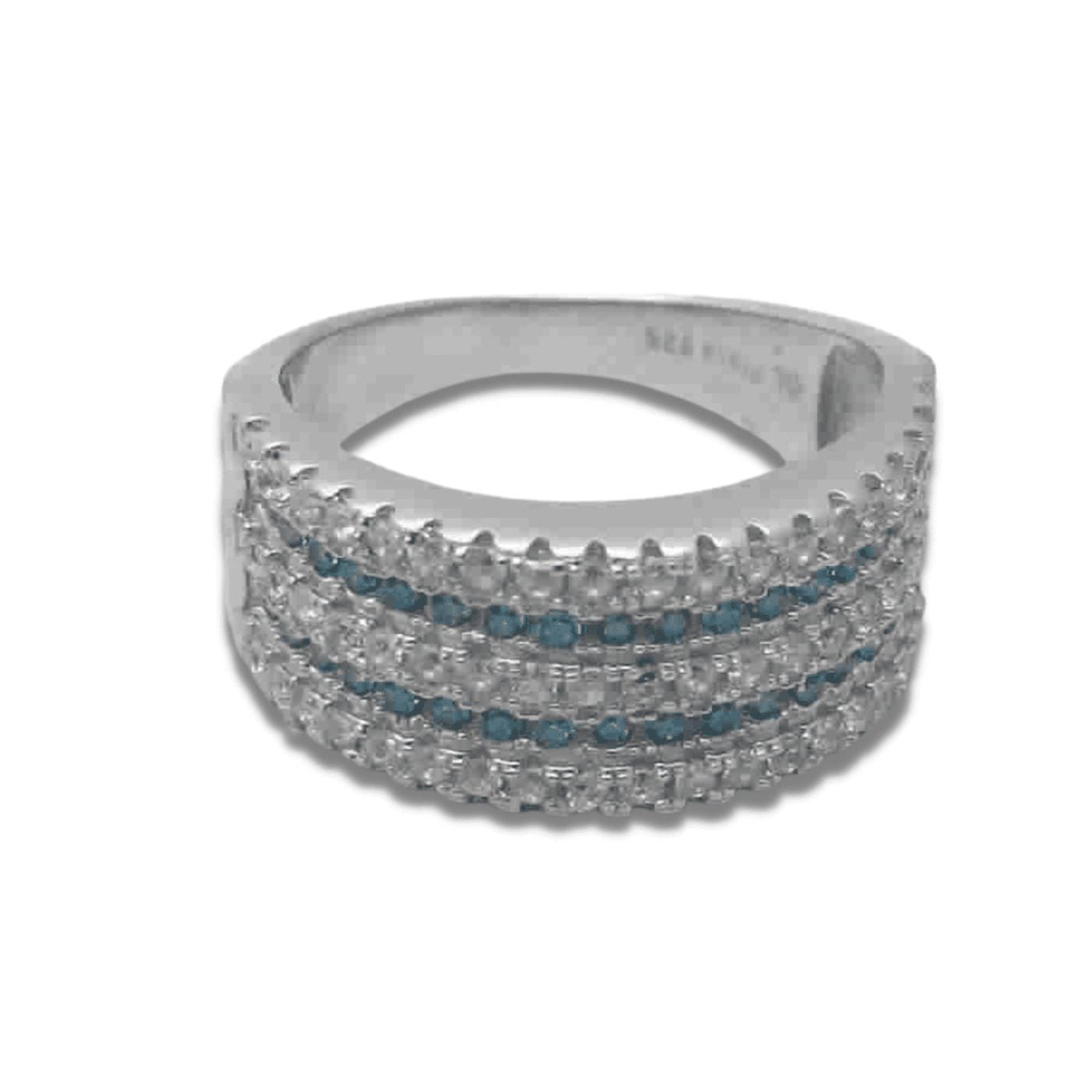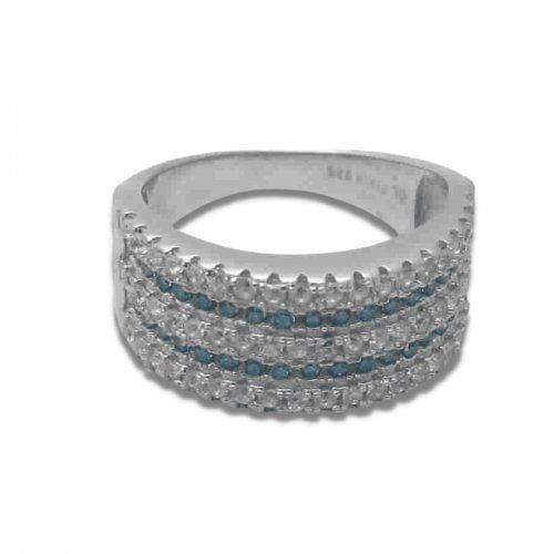 Con baño de rodio, combinada con circonitas en tono piedra Aguamarina y disponible en tallas de la 12 a la 20.