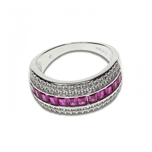 Con baño de rodio, combinada con circonitas en color fucsia, y disponible en las tallas 12 y 16.
