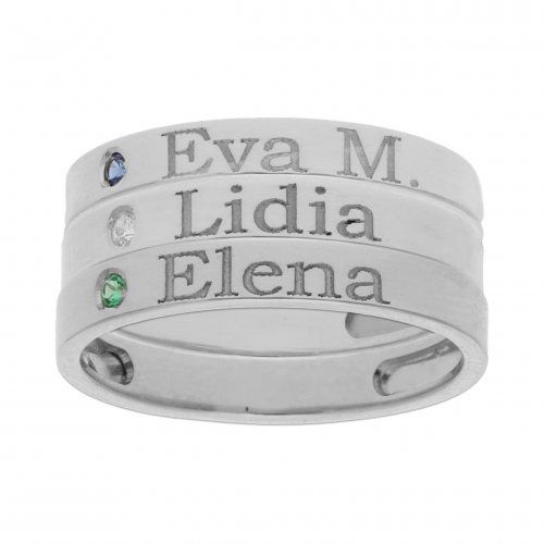 Tres sortijas en una, pero de forma individual cada una (no pegadas) en plata de 1ªley, 925 mm, para personalizar con 3 nombres, y con circonita y crisopales verde y azul.