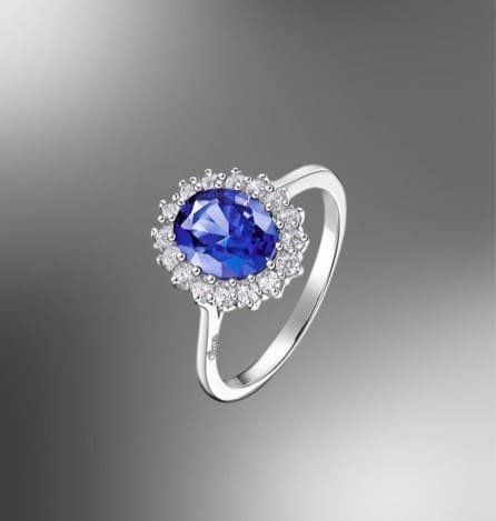 Con circonitas engastadas, y una circonita grande en tono zafiro engastada en el centro.
