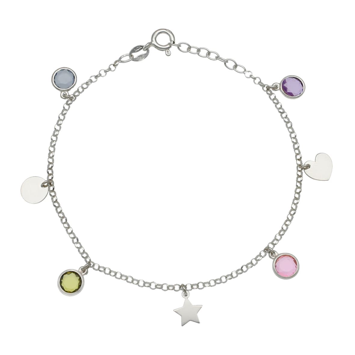 Con mini charms de diferentes motivos (círculos, corazones, estrellas y 4 piedras de colores: Azul, Verde, Rosa y Violeta), con una medida de cada abalorio de 7 mm.