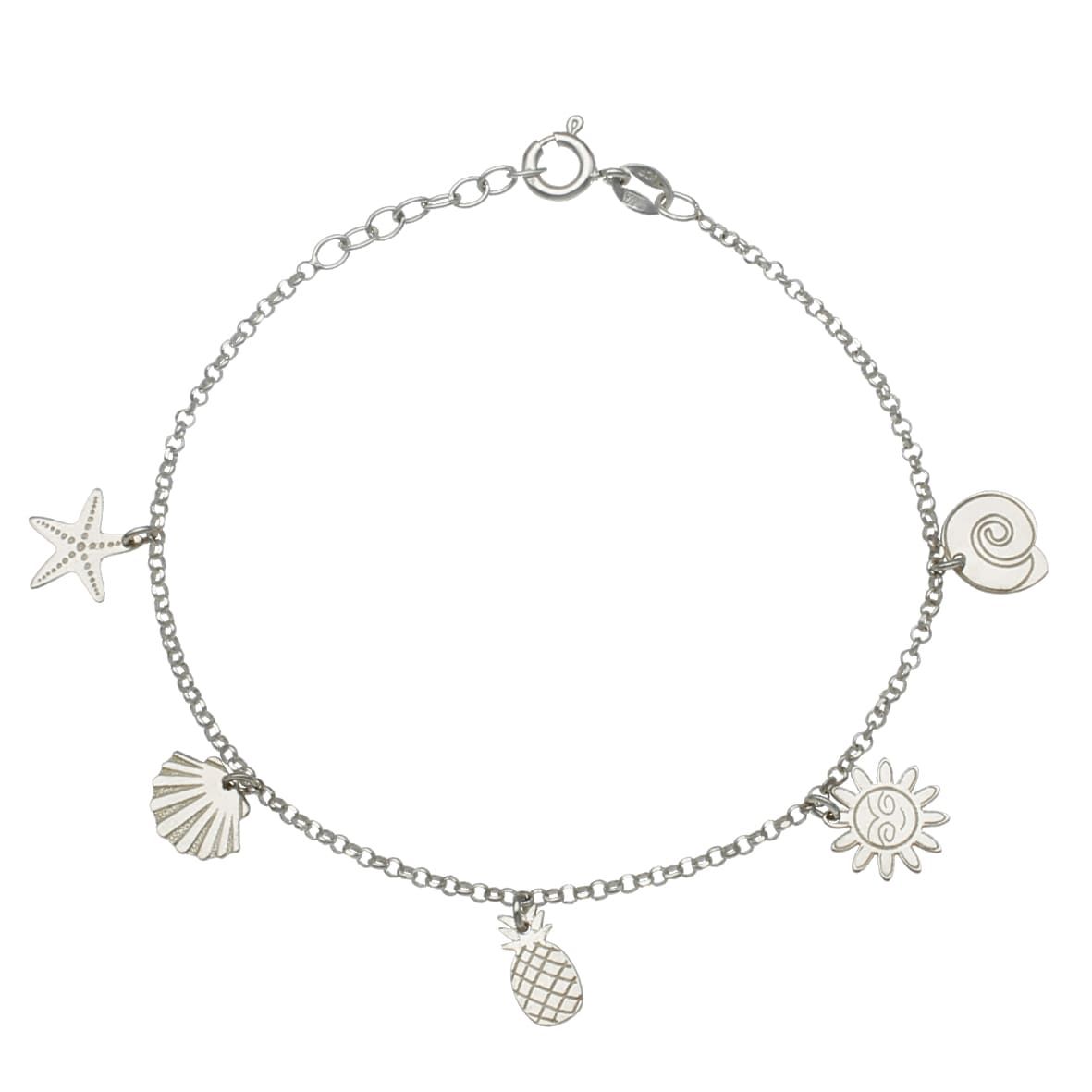 Con mini charms de motivos veraniegos (estrella de mar, concha, piña, sol y caracola), con una medida de cada abalorio de 10 mm.